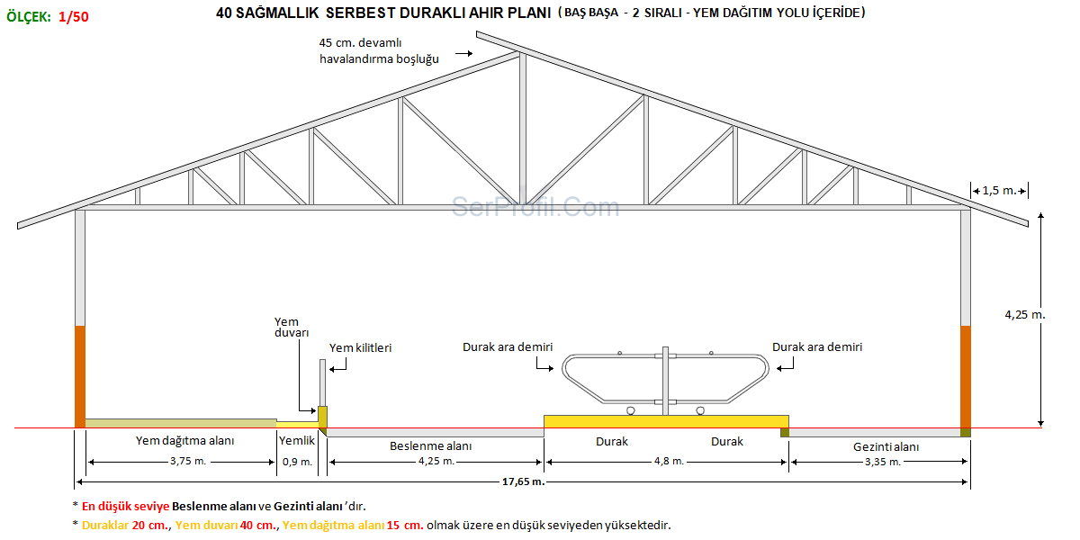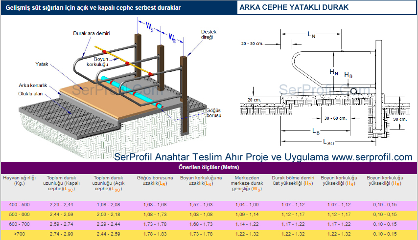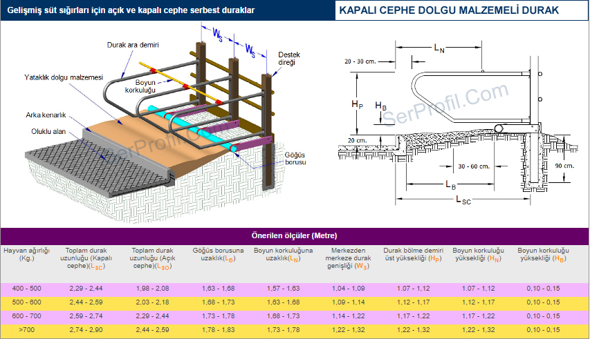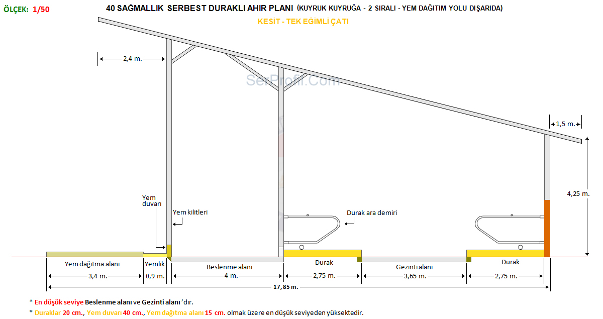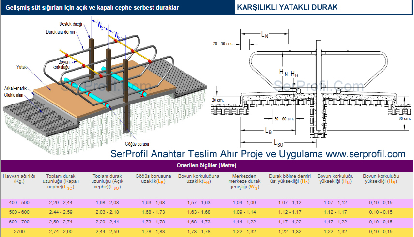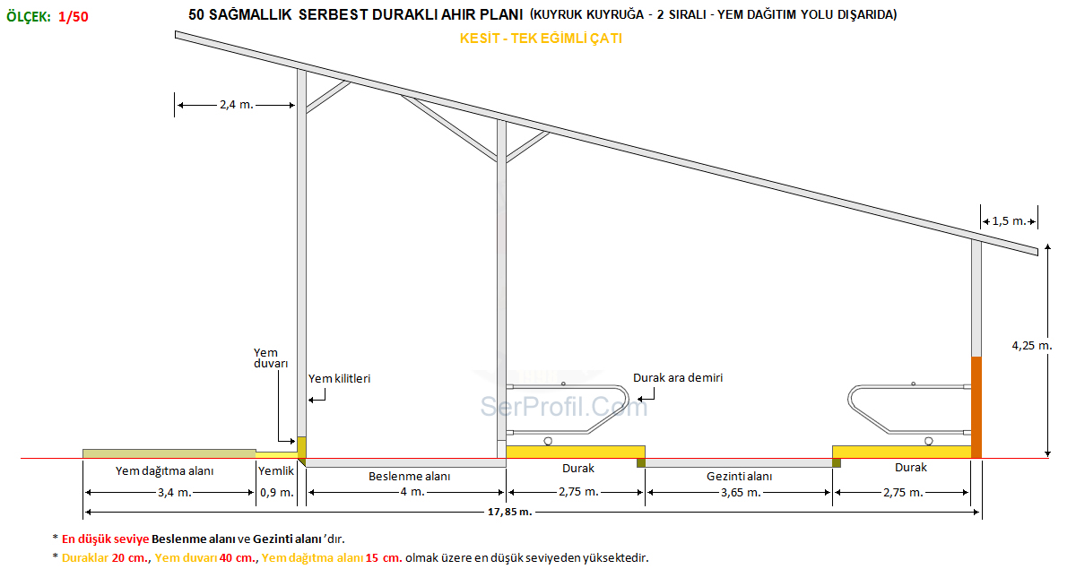Sitemizdeki ahır planlarında yer alan ölçüler kültür ırklarının özellikleri dikkate alınarak verilen ortalama değerler olup üreticilerimiz için ineklerin konforunu ve bakımını kolaylaştıracak nitelikte bir rehber ve bilgi kaynağı sağlamak üzere oluşturulmuştur. Ahırın bulunduğu bölge koşulları, ineklerin ırkı, yaşı ve laktasyon dönemleri de dahil olmak üzere bir çok faktör bu değerleri etkileyebilir.50 Sağmallık Serbest Duraklı Ahır Planları