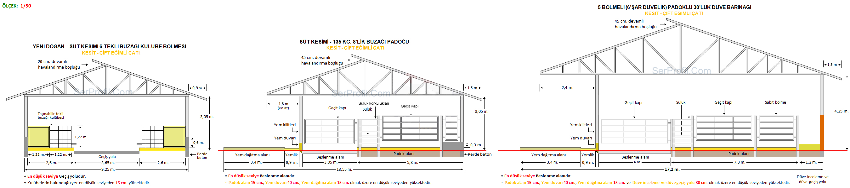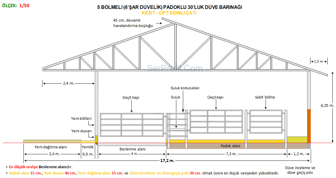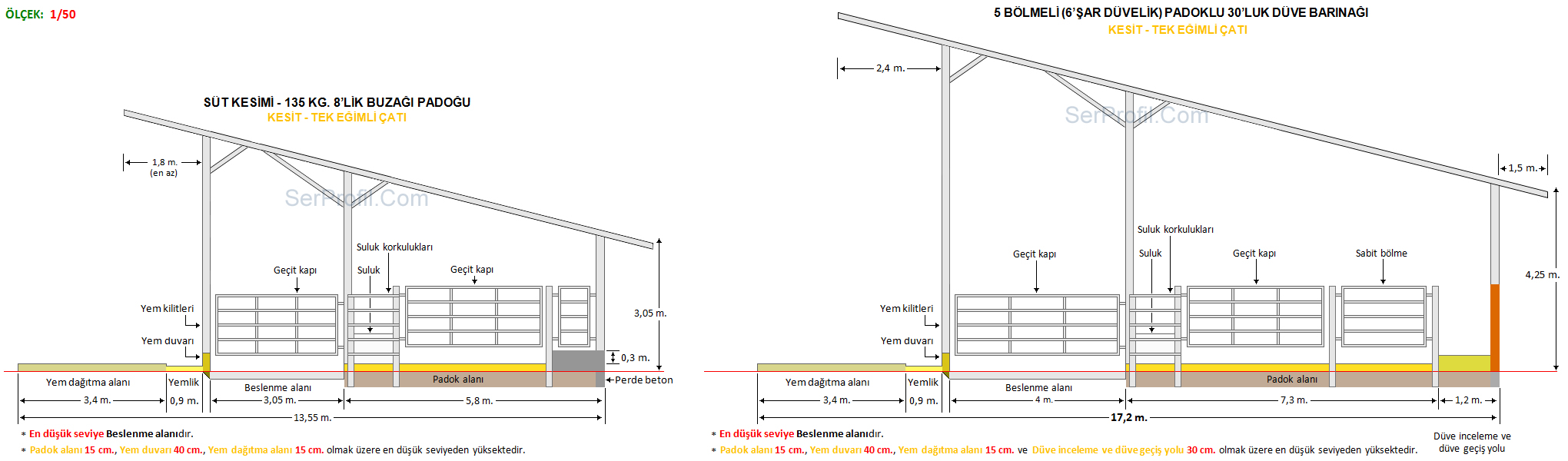 Sitemizdeki ahır planlarında yer alan ölçüler kültür ırklarının özellikleri dikkate alınarak verilen ortalama değerler olup üreticilerimiz için ineklerin konforunu ve bakımını kolaylaştıracak nitelikte bir rehber ve bilgi kaynağı sağlamak üzere oluşturulmuştur. Ahırın bulunduğu bölge koşulları, ineklerin ırkı, yaşı ve laktasyon dönemleri de dahil olmak üzere bir çok faktör bu değerleri etkileyebilir.50 Sağmallık Serbest Duraklı Ahır Planları